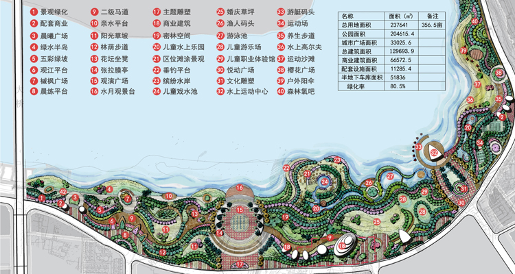 本案以嘉陵江畔魚類、水草、浪花中提取出起伏弧線,將其賦予到場地的平面布局、空間的塑造以及建筑造型之中,打造趣味性的活動空間和特色性的場地層次。合川東津沱兒童公園將成為整個區域內一座優美迷人、帶有濃郁現代生活文化氣息的綜合性非主題旅游公園,在景觀塑造過程中,平衡體現寧靜而又野趣盎然的綠化空間、活力四射的都市活動場地、新奇有趣的兒童體現游戲天堂以及綠色生態的運動場地,打造嘉陵江畔新的城市地標。