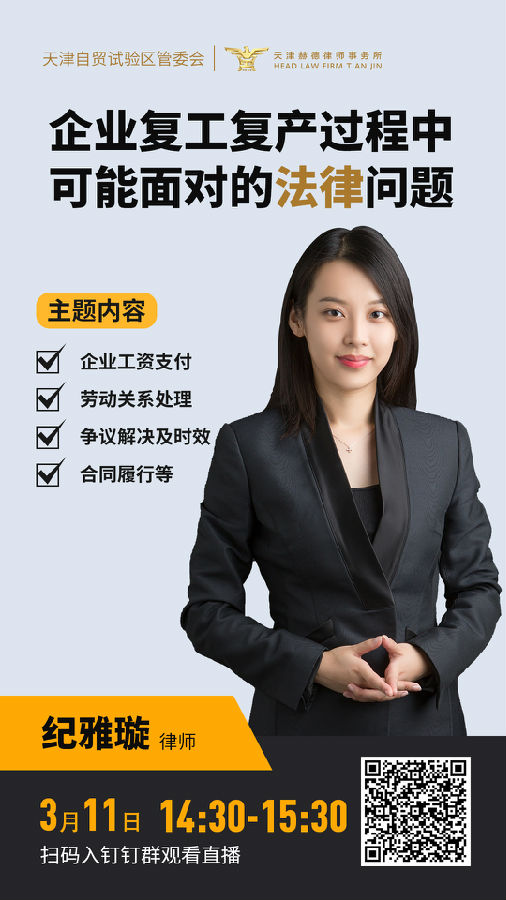 3月11日(周三),天津赫德律師事務所紀雅璇律師將走進自貿區直播間,圍繞企業工資支付、勞動關系處理、爭議解決及時效等防疫復產期間企業可能面對的法律問題進行解釋說明,歡迎企業持續關注。