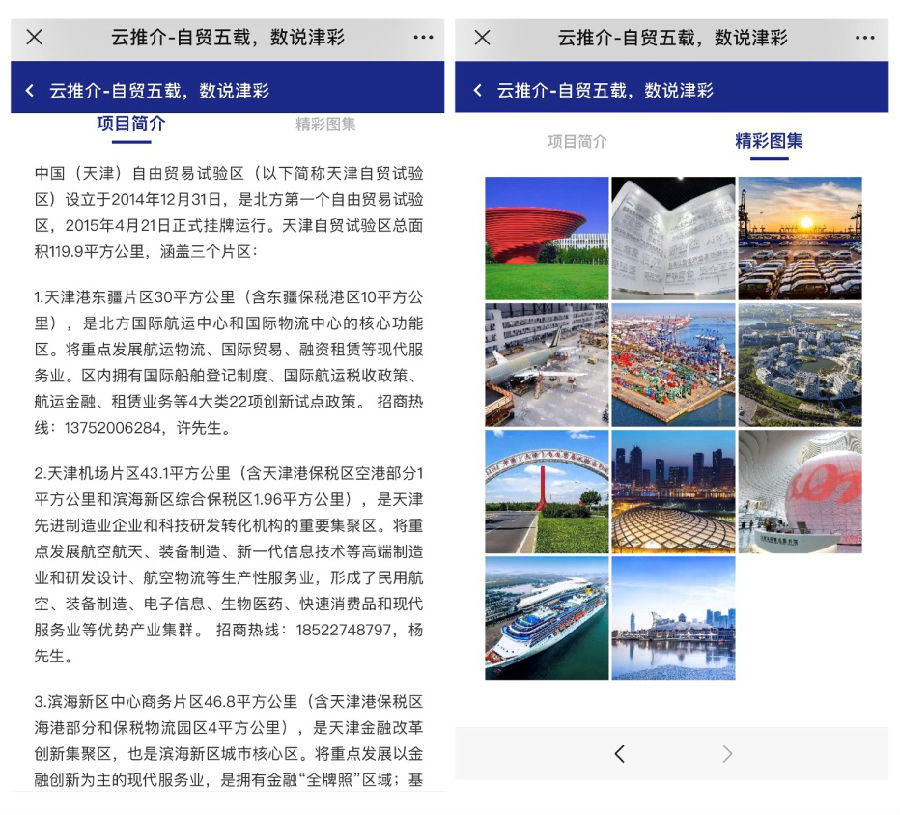 圖文部分則展示了天津自貿(mào)試驗(yàn)區(qū)在國(guó)家頂層設(shè)計(jì)的戰(zhàn)略規(guī)劃下,于退海之地“破繭而出”的成長(zhǎng)姿態(tài)和建設(shè)情況。介紹各片區(qū)功能定位、特色產(chǎn)業(yè)、區(qū)域優(yōu)勢(shì)等內(nèi)容的同時(shí),為“漫步云端”的廣大參與者提供了聯(lián)系方式,積極推進(jìn)自貿(mào)試驗(yàn)區(qū)招商引資工作。