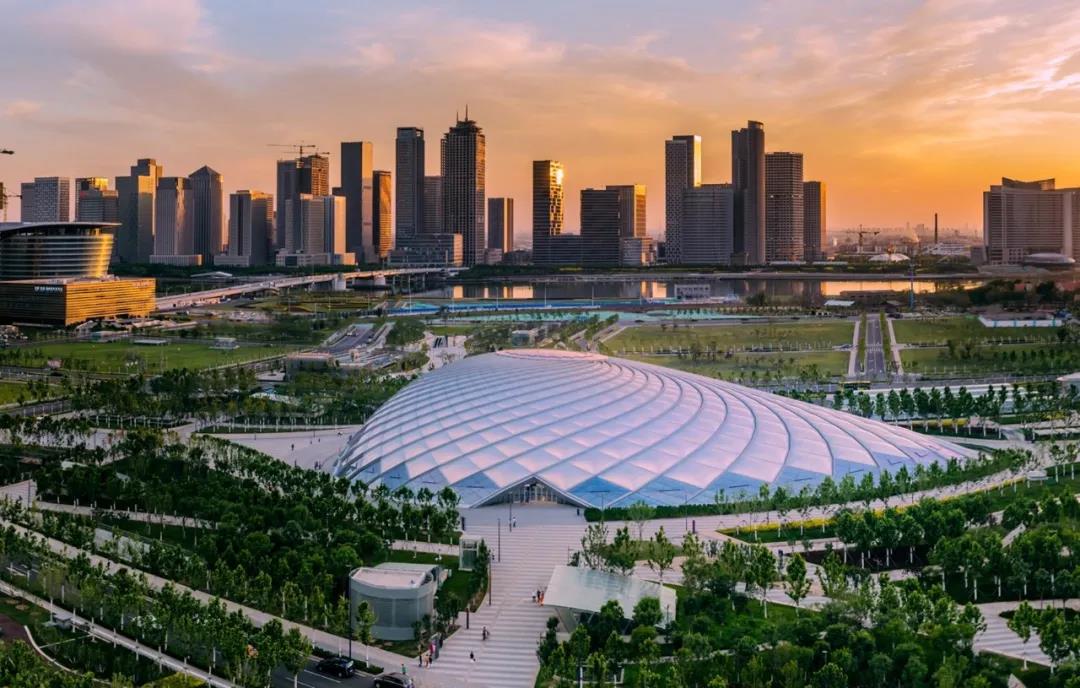 從濱海站望去,周圍是高樓林立的商務區,中間是全地下高鐵站房上設計下沉式休閑公園綠化,只有穹頂位于地面以上,猶如海河畔鑲嵌了一枚銀色的貝殼,整體美景渾然天成。