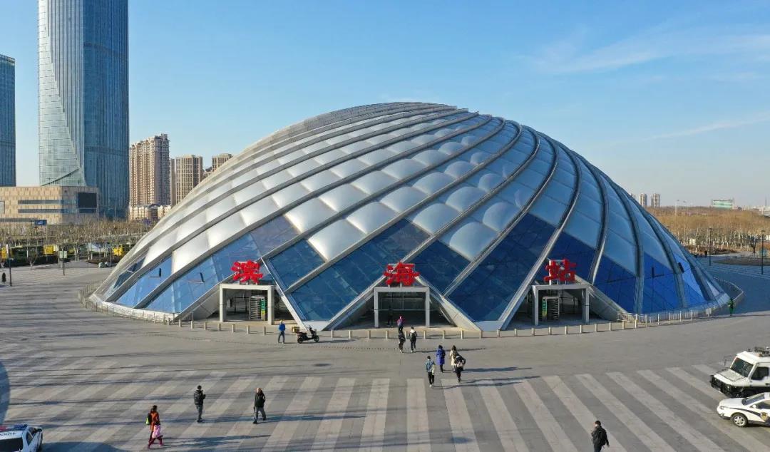 濱海站是集城際鐵路、地鐵、有軌電車為一體的現代化、多層次立體交通樞紐,具備高速、高效周轉大量人流、物流的能力。在這座地下車站內,旅客可以仰望天空,也可通過透明的穹頂看到周圍的如畫景致。