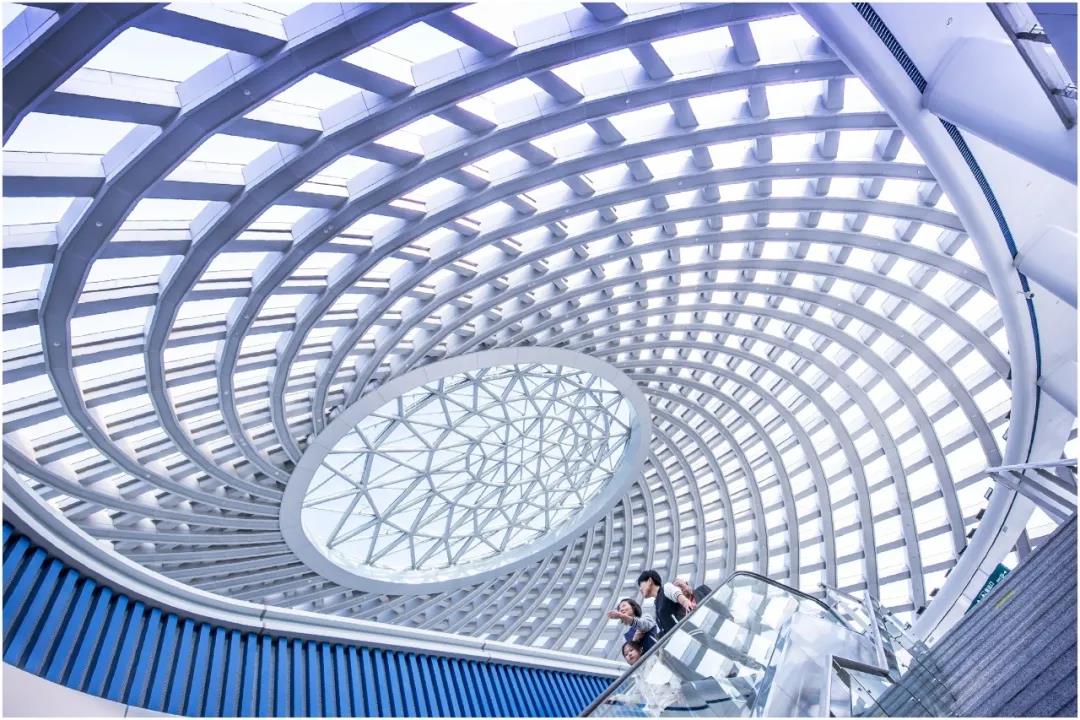 “貝殼”形大跨度穹頂南北向長143.9米,東西寬度80.9米,最高點離地面25.8米,重達4200噸,相當于半個埃菲爾鐵塔的重量,主要桿件采用36根正螺旋和36根反螺旋變截面曲線鋼箱梁相互交叉連接。