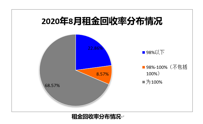 2020年8月租金回收率為100%的樣本企業占比為68.57%,租金回收率在98%-100%之間樣本企業占比為8.57%,租金回收率在98%以下的占22.86%。與7月份相比租金回收率100%的占比下降4個百分點。總體來看,8月樣本企業租金回收狀況較上月小幅下降,與運營能力指數基本一致。