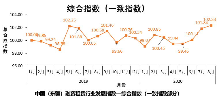 1、8月份融資租賃行業發展指數的一致指數進一步升高,達到102.33點,漲幅小于6、7月份。