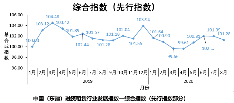 綜合指數的一致指數2020年8月的數值為102.33點,與上月的101.84點相比上漲0.49點,與6、7月份相比漲幅明顯減少。綜合指數的先行指數在7月為101.99點,8月小幅下降到101.28點。綜合指數的先行指數與一致指數的趨勢趨同性更為明顯。可以推斷未來數月融資租賃行業的景氣程度將會較大概率處于平穩或微調的狀態。