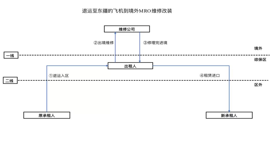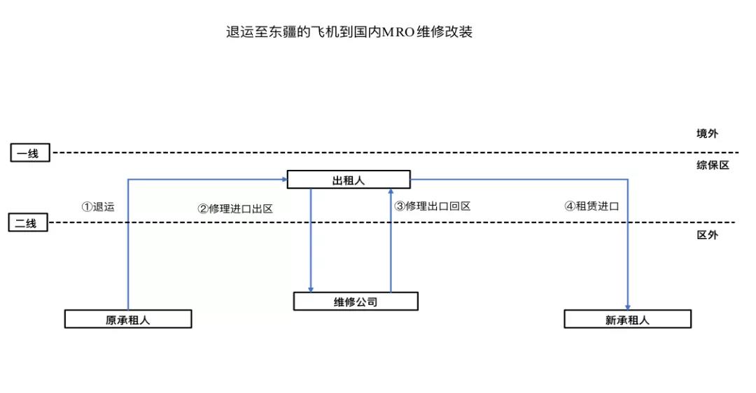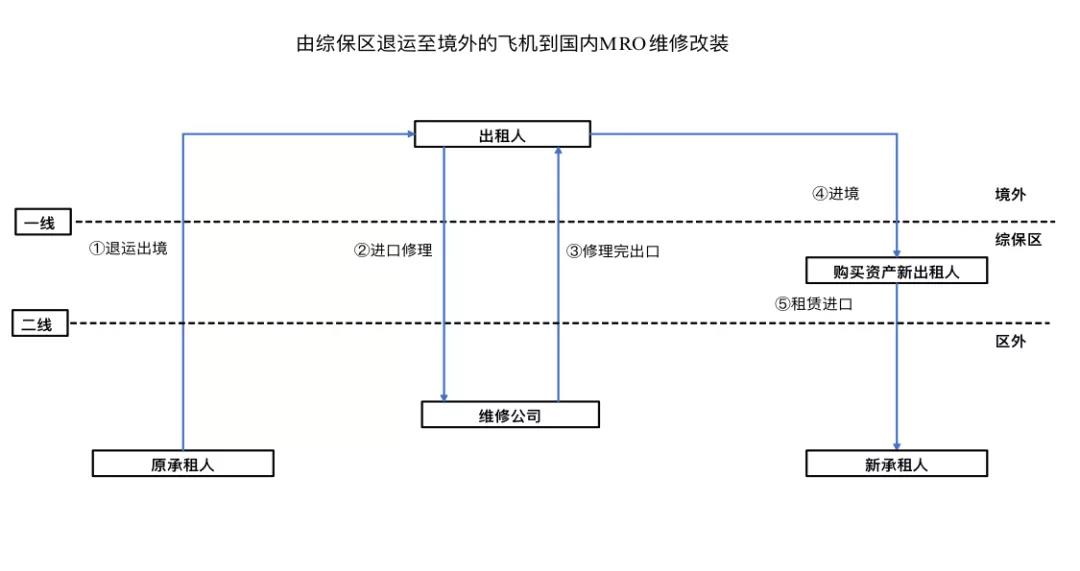 飛機為綜保區SPV持有,以保稅租賃方式租賃給國內航空公司,租賃結束后飛機退回到綜保區SPV,需要到境外飛機改裝商處進行改裝后,回到綜保區,租賃給國內貨運航空公司。