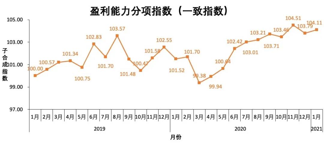 3、1月份融資租賃行業盈利能力的一致指數小幅上升,為104.11點。