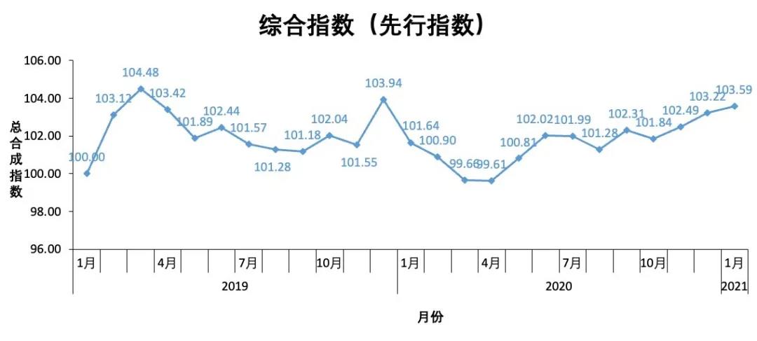 綜合指數的一致指數在2021年1月的數值為102.42點,較2020年12月的101.46點相比有較大幅度上升,最近三個月(11月、12月和1月)的一致指數與前期先行指數的趨勢基本吻合;綜合指數的先行指數,2020年9 月上升到102.31 點,在 10 月下降到 101.84 點,2020年11月上升到102.49點,2020年12月上升到103.22點,2021年1月上升到103.59點,自 2020年8月份以來,先行指數處于波動上升的狀態,向上趨勢較為明顯。綜合以上分析,綜合指數的一致指數在2021年1月份達到自2019年1月以來的最高點,根據綜合指數的一致指數的趨勢可以推測融資租賃行業大概率持續景氣,波動上升。