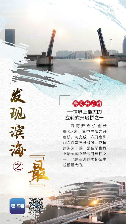2010年7月,海河開啟橋通車,它橫跨海河下游是世界上最大的立轉式開啟橋之一,承載著海河兩岸的車水馬龍。