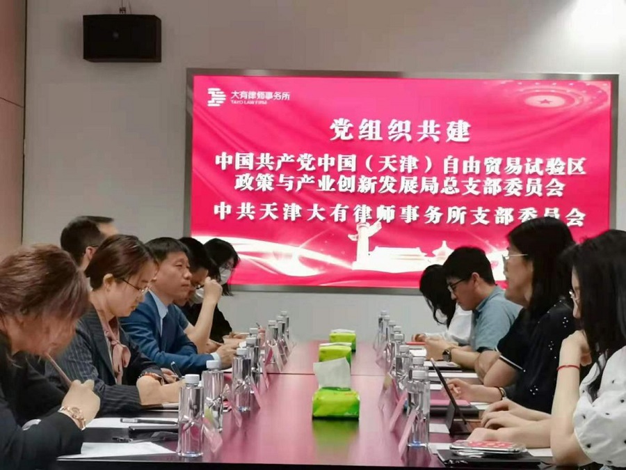 為深入學習貫徹黨的十九屆五中全會精神,堅持以習近平新時代中國特色社會主義思想為指導,充分發揮黨員先鋒模范作用,努力構建“資源共享、互利共贏、雙向促進、共同提高”的黨建工作新格局,中國共產黨中國(天津)自由貿易試驗區政策與產業創新發展局總支部委員會與中共天津大有律師事務所支部委員會聯合開展了“黨建共建、共贏未來”共建交流活動。