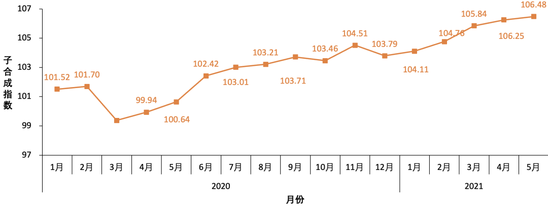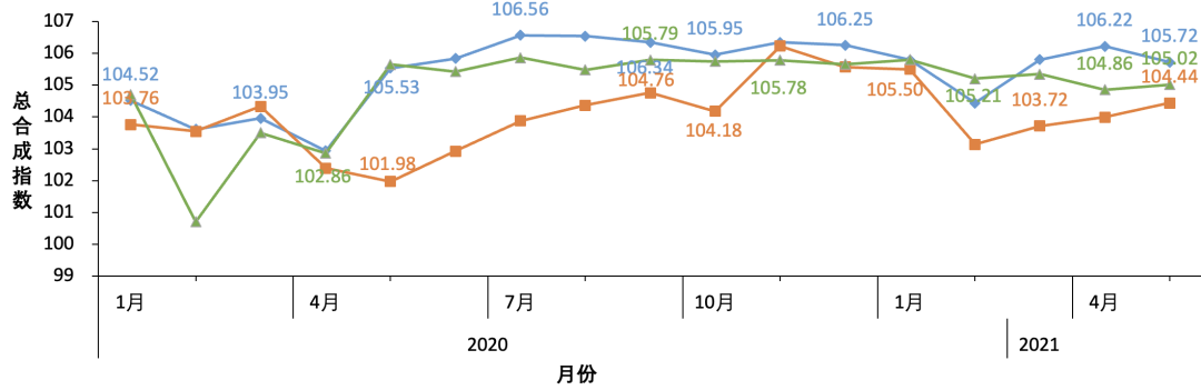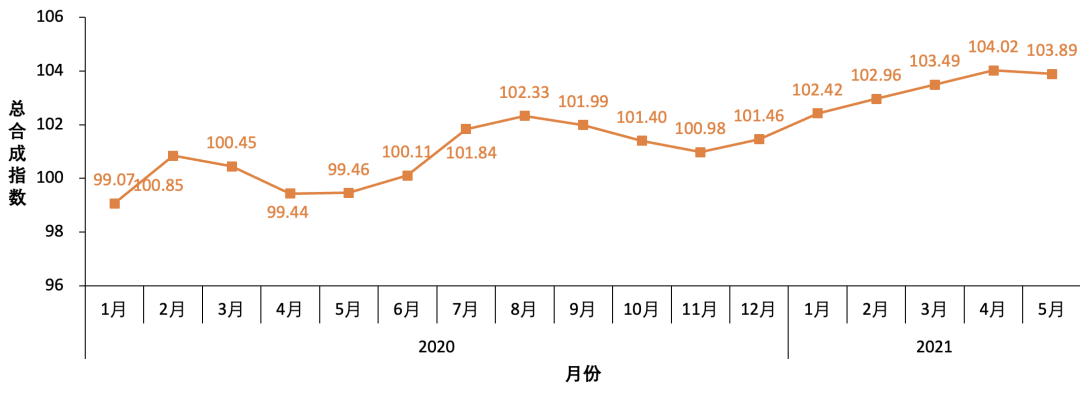 綜合指數的一致指數在2021年5月的數值為103.89點,較2021年4月的104.02點相比有小幅下降,與2021年2月份的先行指數的下降相對應,最近三個月(2月、3月和4月)的一致指數與前期先行指數的趨勢基本吻合;綜合指數的先行指數2021年1月上升到103.59點,2021年2月小幅下降到103.22點,2021年3月上漲到104.72點,2021年4月上漲到104.99點,2021年5月下降到104.86點。自 2020年8月份以來,先行指數處于波動上升的狀態,向上趨勢較為明顯。