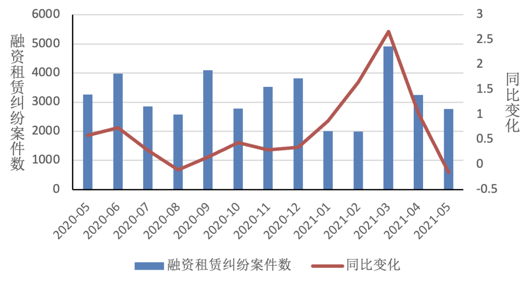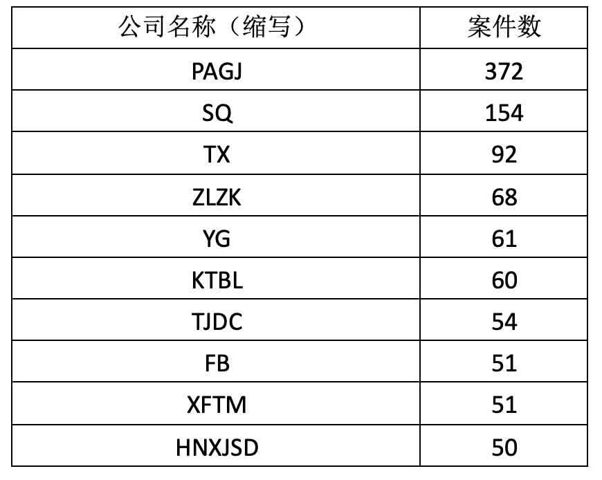 與融資租賃全行業樣本企業相關的5月份開庭案件數約2764件,2020年同期開庭案件數3263件,2021年5月同比下降約15.29%,其中本月開庭數前十的融資租賃企業如下表所示。
