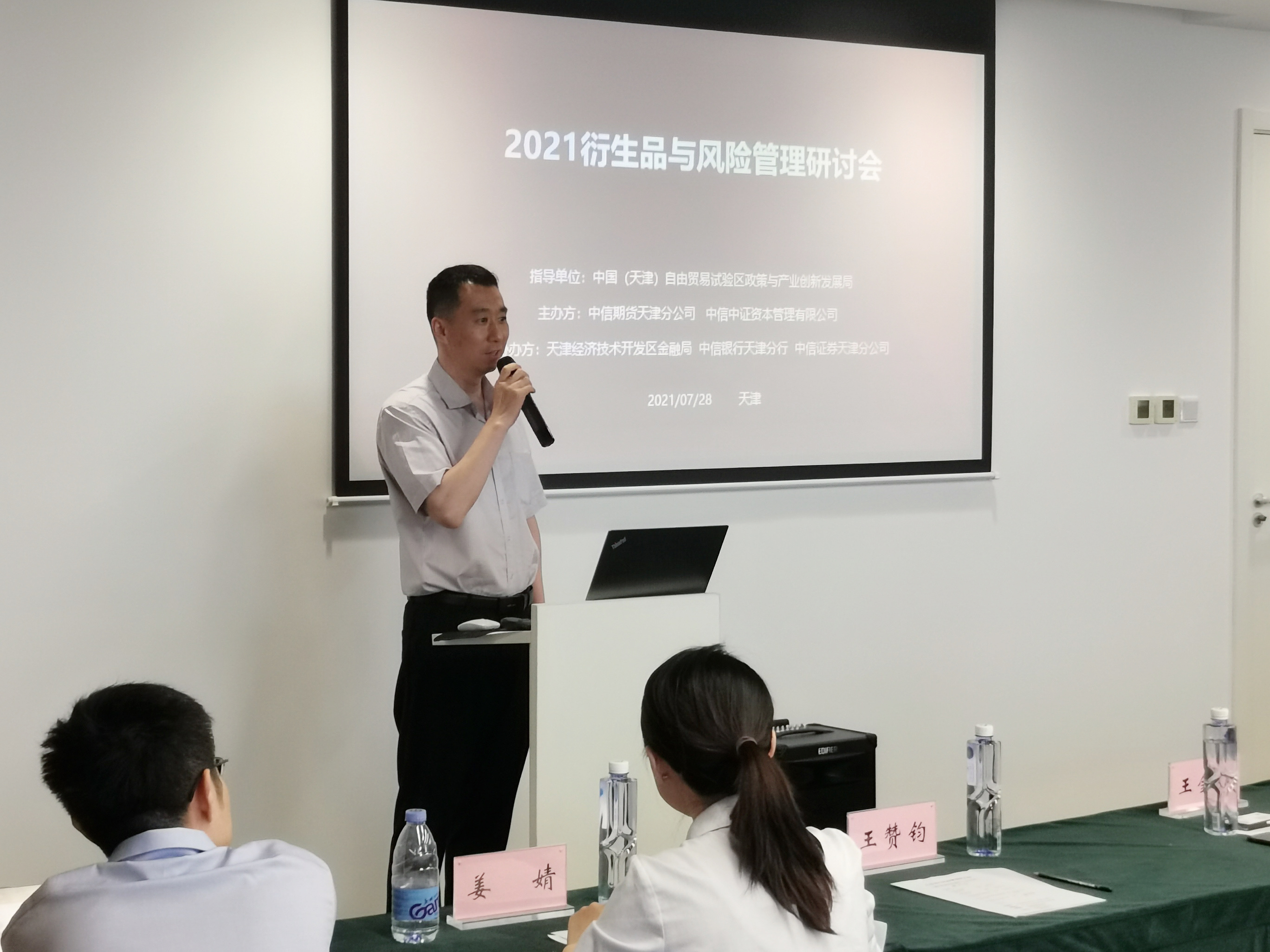 近日,由中國(天津)自由貿(mào)易試驗區(qū)政策與產(chǎn)業(yè)創(chuàng)新發(fā)展局(以下簡稱“自貿(mào)區(qū)創(chuàng)新發(fā)展局”)發(fā)起并指導(dǎo),由中信期貨有限公司天津分公司、中信中證資本管理有限公司共同主辦,天津經(jīng)濟技術(shù)開發(fā)區(qū)金融局、中信銀行天津分行、中信證券天津分公司共同支持的“2021衍生品與風險管理研討會”在濱?;鹦℃?zhèn)路演中心順利舉行。自貿(mào)區(qū)創(chuàng)新發(fā)展局副局長劉宇、中信期貨經(jīng)紀業(yè)務(wù)發(fā)展與管理委員會領(lǐng)導(dǎo)王金兵出席并致辭,來自招商物產(chǎn)天津公司、天津物產(chǎn)國貿(mào)公司、天津港東疆物流等40余家機構(gòu)的60余名嘉賓出席研討會。