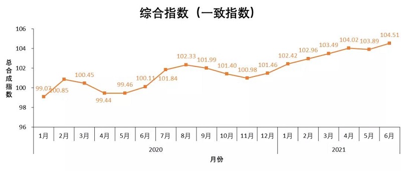 綜合指數的一致指數在2021年6月的數值為104.51點,較2021年5月的103.89點小幅上升,最近三個月(3月、4月和5月)的一致指數與前期先行指數的趨勢基本吻合;綜合指數的先行指數,自 2021年2月以來持續波動上升,在2021年6月上漲到105.11點。