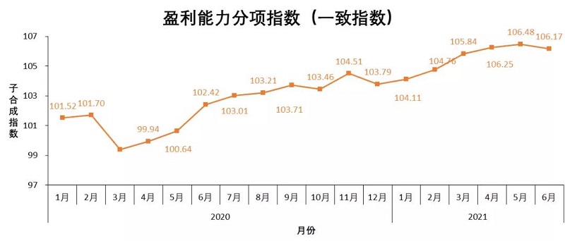 盈利能力分項指數以利潤總額為基準指標。盈利能力分項指數顯示,2021年6月份的盈利能力一致指數下降,由2021年5月份的106.48點下降到2021年6月份的106.17點,較2020年6月份的102.42點增加3.75點,同比增幅較大;盈利能力先行指數自2021年2月以來持續在104.5左右波動,相對穩定,且都低于2021年1月的105.01。