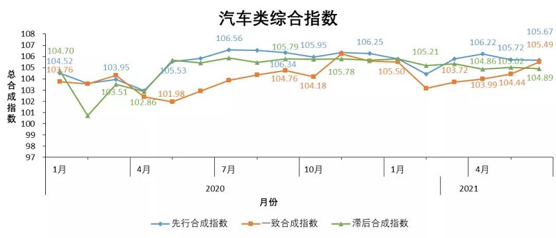 2021年6月份的汽車類發展一致指數有所上升,由2021年5月份的104.44點上升到2021年6月份的105.49點,較2020年6月份的102.93點上升2.56點;汽車類發展先行指數自2021年4月起有所下降且已經連續下降2個月,2021年6月份, 汽車類發展先行指數為105.67點。