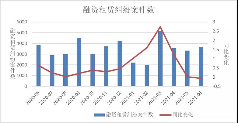 與融資租賃全行業樣本企業相關的6月份開庭案件數約3644件,2020年同期開庭案件數3853件,2021年6月同比下降約5.42%,其中2021年6月開庭數前十的融資租賃全行業樣本企業如下表所示。