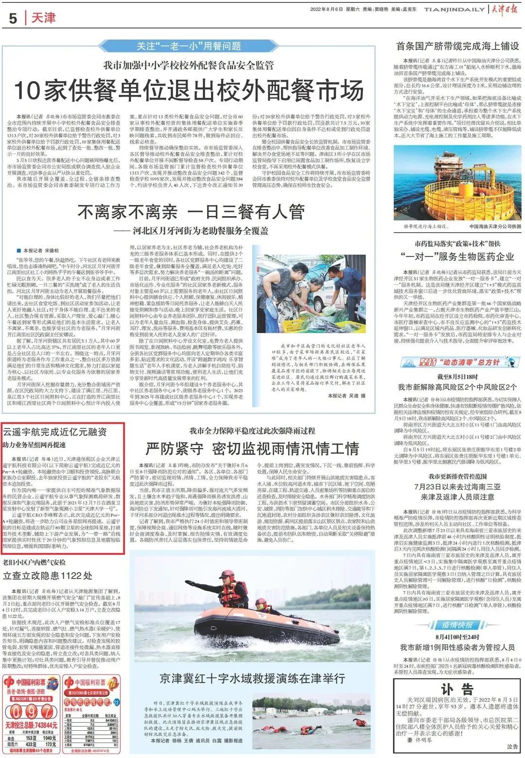 日前,天津日報(bào)刊發(fā)文章《云遙宇航完成近億元融資 助力業(yè)務(wù)星組網(wǎng)再提速》,對保稅區(qū)企業(yè)天津云遙宇航科技有限公司完成Pre-A+輪融資進(jìn)行專題報(bào)道。