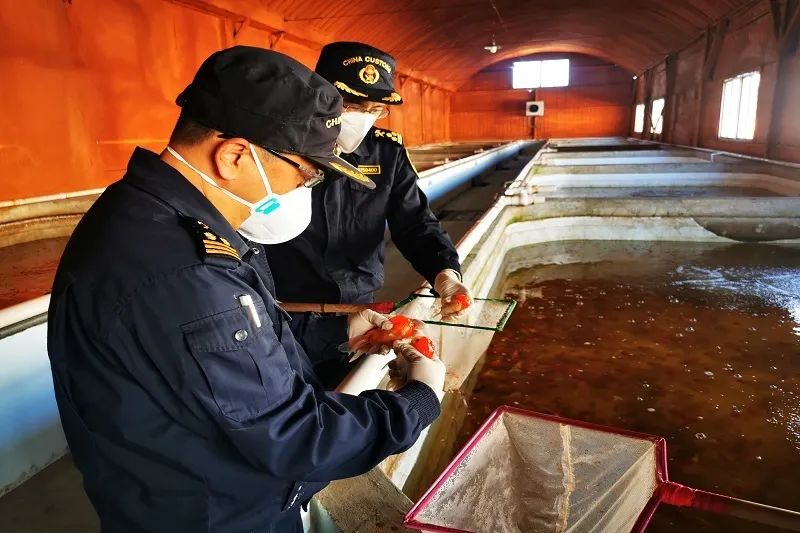 圖為:關(guān)員在出口韓國活魚企業(yè)進行現(xiàn)場監(jiān)管
