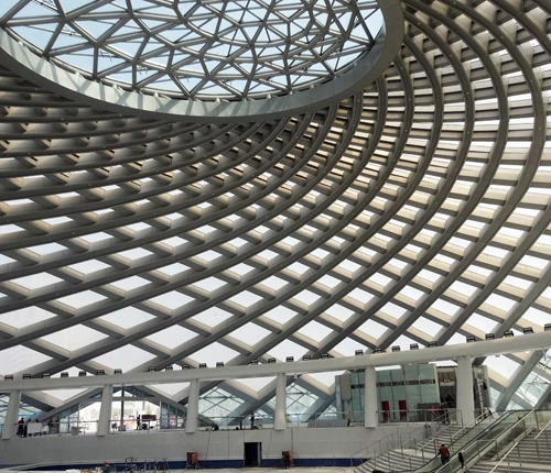 作為于家堡高鐵站唯一露在地面上的“貝殼”,是世界上首個“單層網殼鋼結構體系”,其鋼結構由36根正螺旋和36根反螺旋編織而成,外面覆蓋了700多塊不同尺寸的ETFE膜,經過充氣后,薄膜全部鼓起來,覆蓋于正、反螺旋鋼結構網殼之上,可把地面的光源引入地下,增加層次感并節約能源。