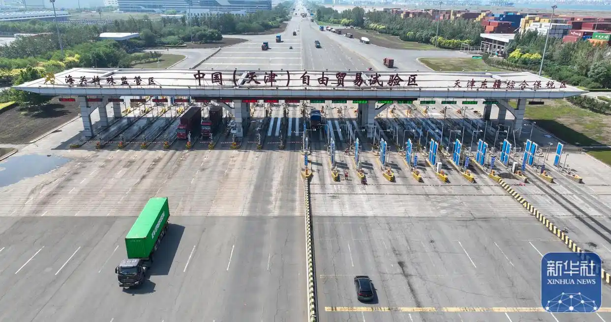 ↑ 這是6月20日拍攝的天津自貿(mào)區(qū)天津港東疆片區(qū)入口處的中國(天津)自由貿(mào)易試驗區(qū)海關(guān)特殊監(jiān)管區(qū)入口(無人機照片)。
