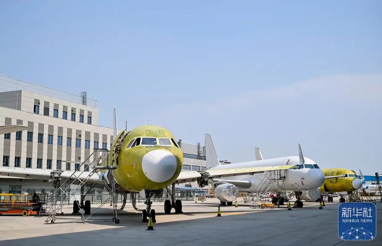 ↑ 6月18日,在天津自由貿(mào)易試驗區(qū)天津機場片區(qū)內(nèi)的天津海特飛機工程有限公司,多架飛機在停機坪上等待保稅維修。