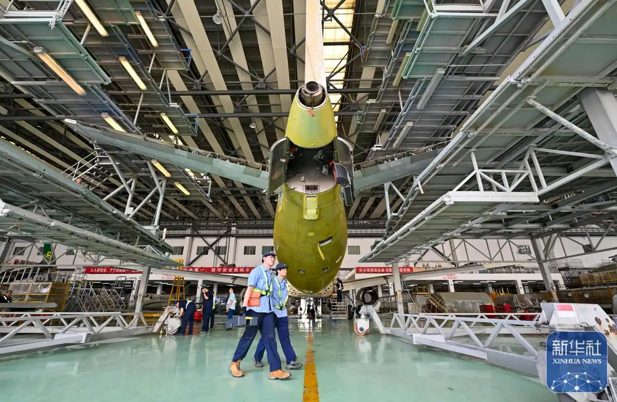 ↑ 6月18日,在天津自由貿(mào)易試驗區(qū)天津機場片區(qū)內(nèi)的天津海特飛機工程有限公司,工作人員在機庫內(nèi)對飛機進行保稅維修。
