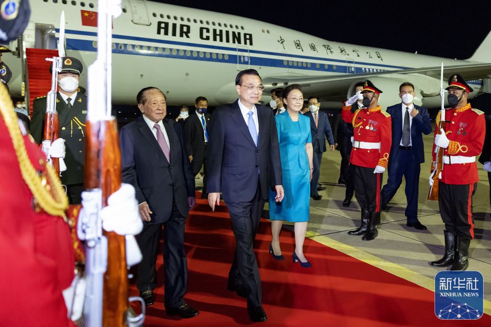 柬埔寨副首相賀南洪率政府高級官員到機場迎接。禮兵沿紅地毯兩側列隊致敬。當地青年向李克強和夫人程虹獻上鮮花。中國駐柬埔寨大使王文天和駐東盟大使鄧錫軍也到機場迎接。