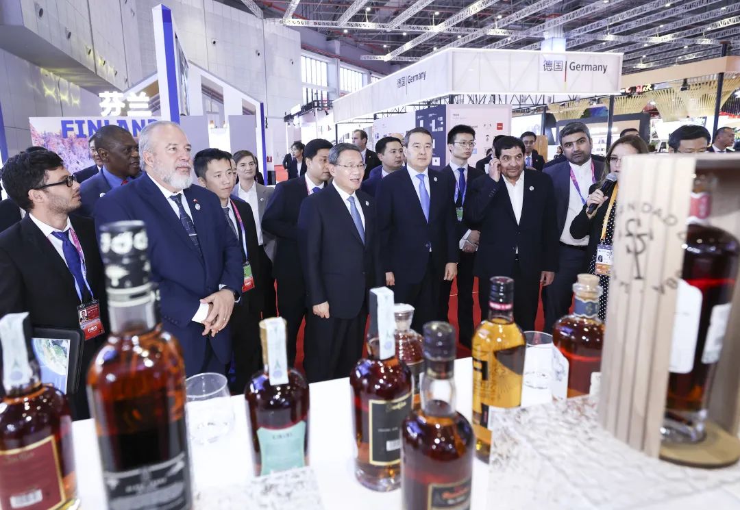 開幕式前,李強參觀了企業(yè)展。開幕式后,李強同與會外國領(lǐng)導人共同巡館。