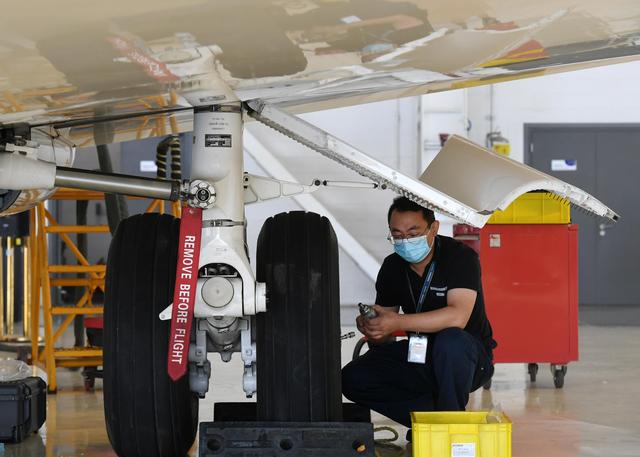 ↑9月17日,天津海特飛機工程有限公司工作人員在機庫內進行維修作業。
