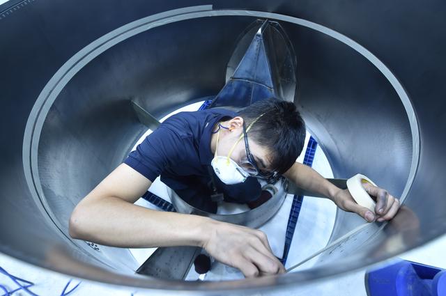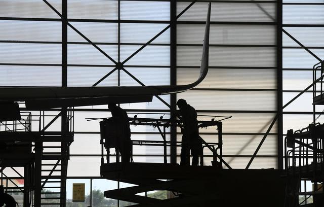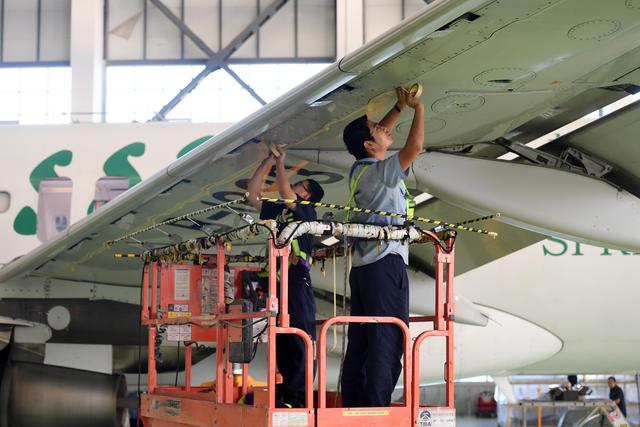 ↑ 古德里奇航空結構服務(中國)有限公司工作人員在車間內進行維修作業(8月20日攝)。