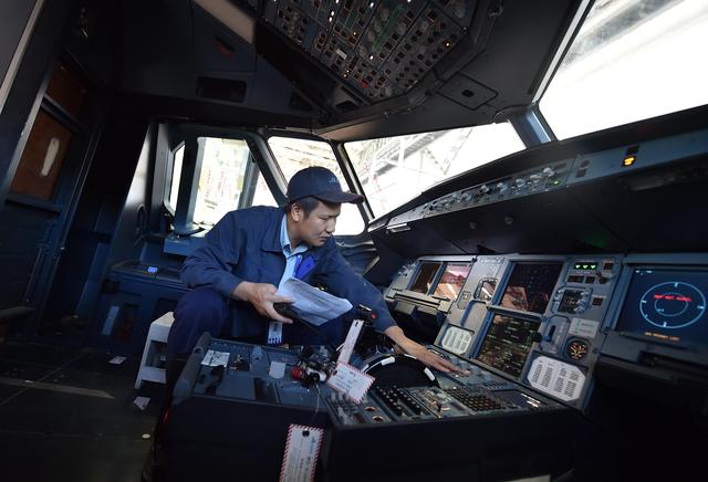 ↑9月17日,天津海特飛機工程有限公司工作人員在飛機機艙內進行檢測作業。