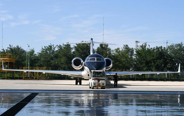 ↑9月17日,龐巴迪(天津)航空服務有限公司工作人員在機坪檢查飛機機身。