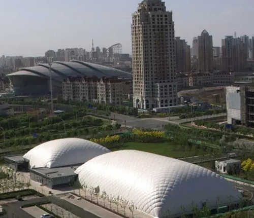 設計總面積為27612平方米的泡泡體育中心位于中心商務區響螺灣迎賓大道與新港路交口的東南角。從外形上看,氣膜體育館像一大一小的兩個氣球,但這兩個建筑并沒有一磚一瓦。這就是用雙面二氧化碳涂層等特殊材質建造而成的氣膜體育館。