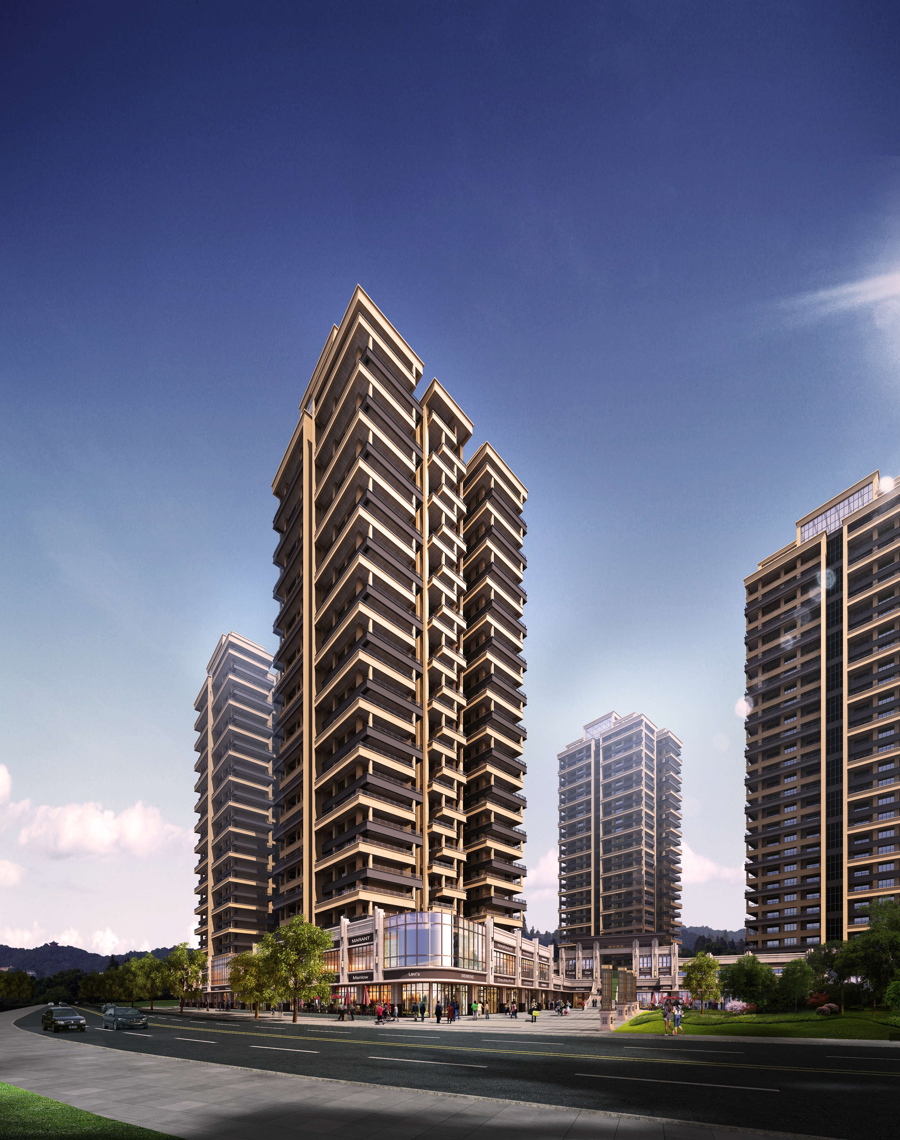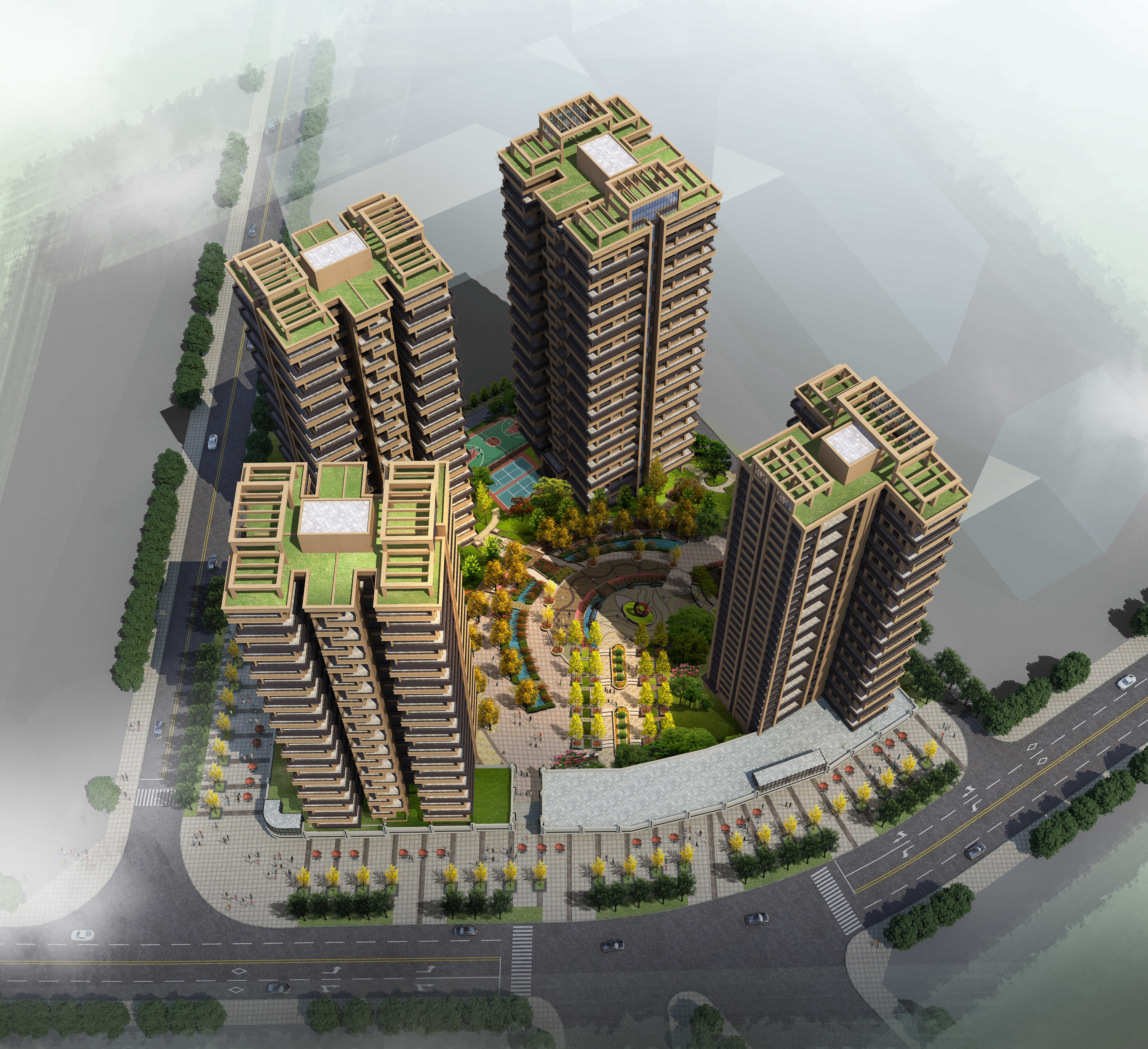 The plan adopts the enclosure layout of the whole high-rise large and middle court,with a total of 4 point-type high-rise buildings designed。The business is arranged in a belt along the road,leaving a larger node of the city square at the main entrance and the back of the building at the intersection of the road,expanding the space of the city road and sidewalk,and providing more leisure space for the citizens。