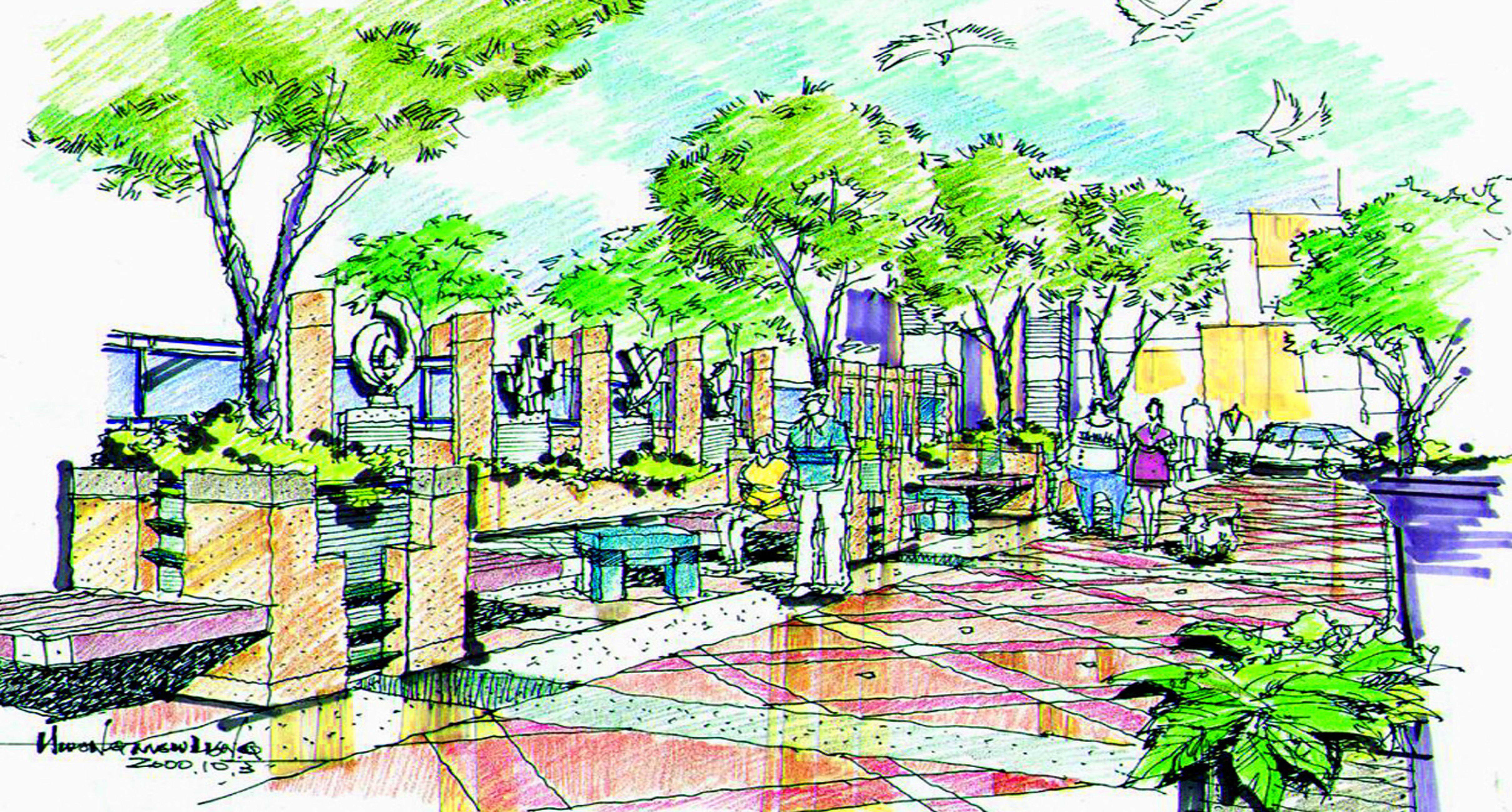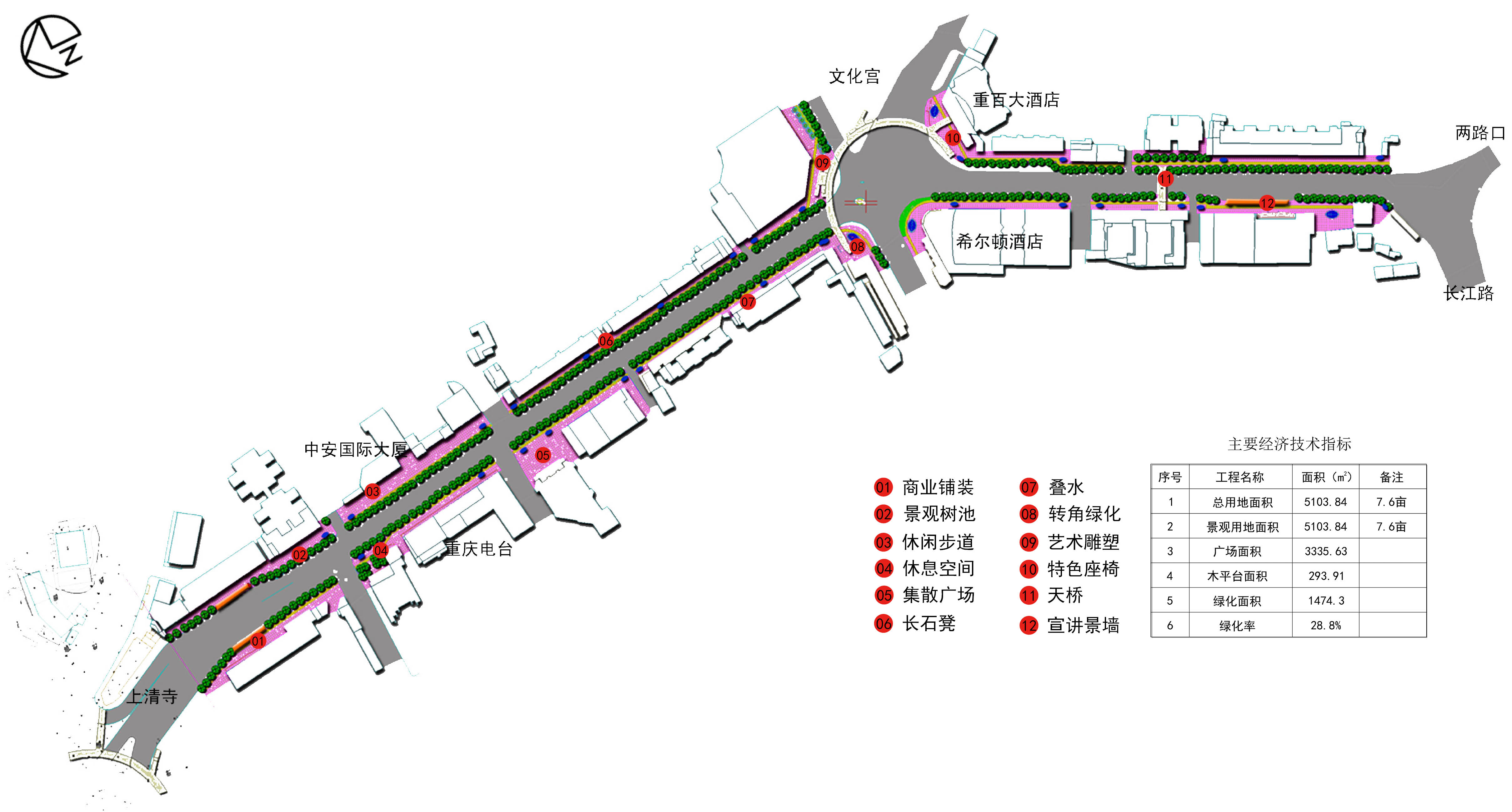 The landscape design of the street focuses on the combination of the surrounding land use and architectural style. Based on the meeting the pedestrian shade and safe passage, we add some landscape elements such as features pavement, casual seating, scene sculpture, urban furniture, eco-green to enhance the vitality and fun of the street.