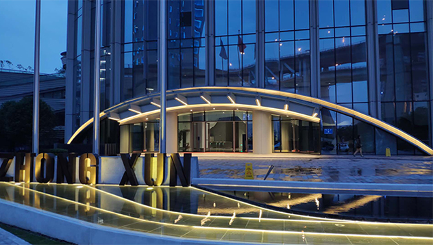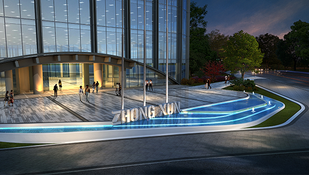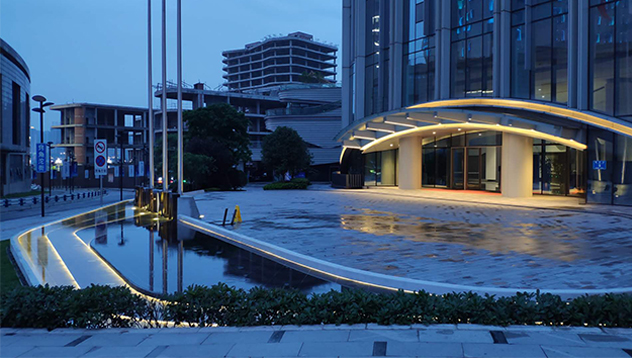 The building behind the square is the main body of the whole project. The overall style fits the design style of the main body of the building and integrates modern, curved and fashionable design elements. The waterscape is designed with a mirrored pool.The single-layer drop is designed with no boundary, and the height difference is 125mm. The bottom of the pool design 50mm high difference level, buried in the lamp belt to form a stunning artistic effect in the night.