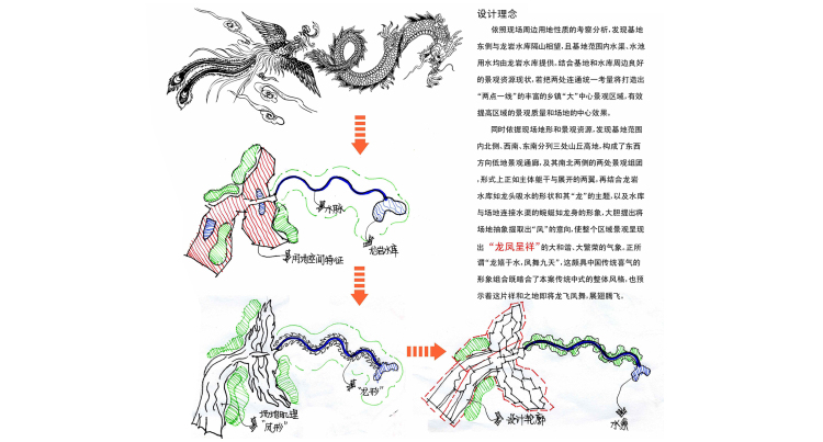 Tuanxi memorial plaza is in the center of Tuanxi town, close to the town government and the courts, and will be the political, economic and cultural center. So the plaza is designed as a memorial one, but also has the function of municipal plaza and commercial plaza. Considering the public use, the plaza can be place for culture, leisure and entertainment.The design concept is based on the site topography and landscape resource. Because the topic is dragon, and the east of the shape of the eastern Longyan reservoir looks like dragon head, and the canal connects the reservoir and site is like the dragon body, we put forward the idea of "Phoenix" to make the entire region to be harmonious and prosperous with "Phoenix and dragon". And such combination is very traditional and Chinese, and also indicates that the site will be flourishing and auspicious in the future.