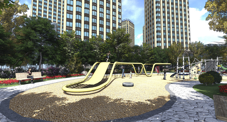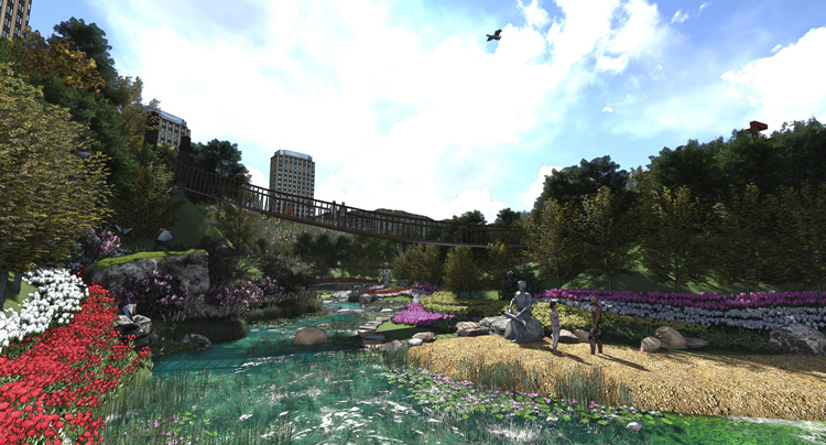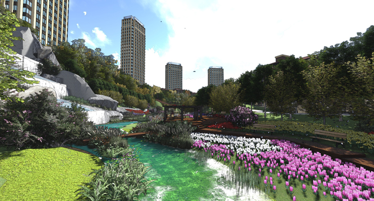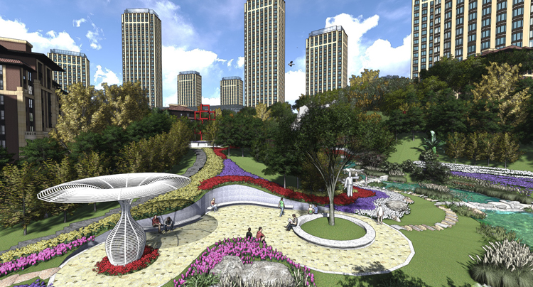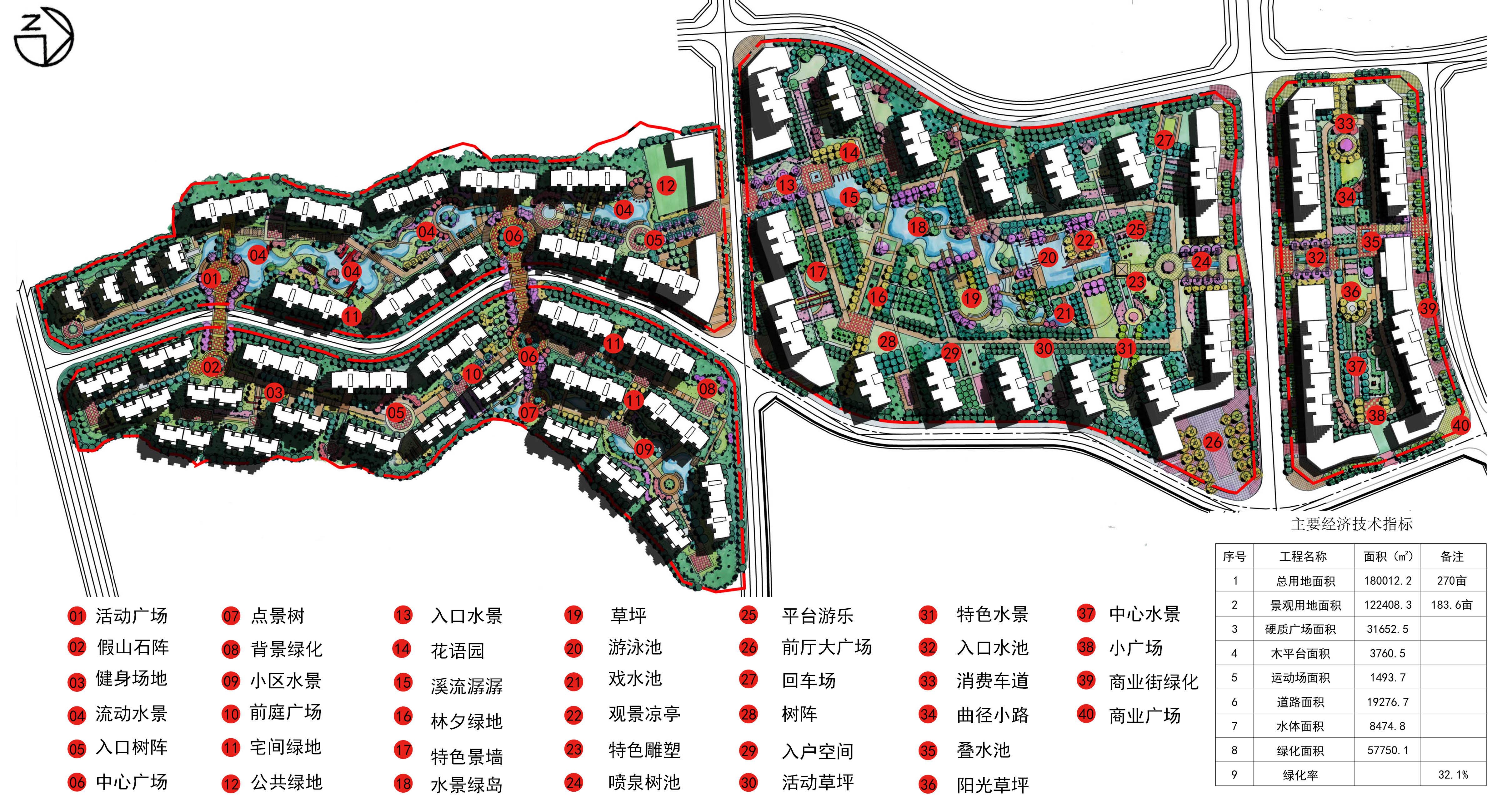The land of project is shaped in elongated strip,which is divided into three sections by two roads crossing the entire land space, each region has a good traffic conditions.Because the residential area which have a large area, close to the road, we use axis and the squares to link with the residential entrance and outside world,to form a plurality of transparent view corridors and landscape amorous feelings avenue.The whole design mainly use poly line to organize space,use the modern style to reflect the simplicity and fashion sense of site,while,interspersed rounded square as a landscape nodes. In premise of respecting the original terrain and natural resources,we have a development and utilization of water bodies,which water features throughout the site, improving the local micro-climate, at the same time meeting requirements of the everyday needs of water-based leisure for people.