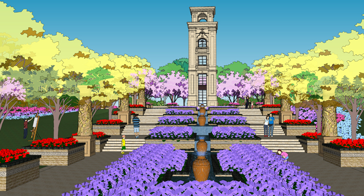 In the concrete design, taking into account the unity of landscape and architectural style, the style of the landscape is Art-Deco style too. We adopt the the French romantic tone of the simple European style as the main style. And the multi-layer platform, prominent axis and open pools and canals and so on are also be connected with the existing terrain, landscape layout and so on.