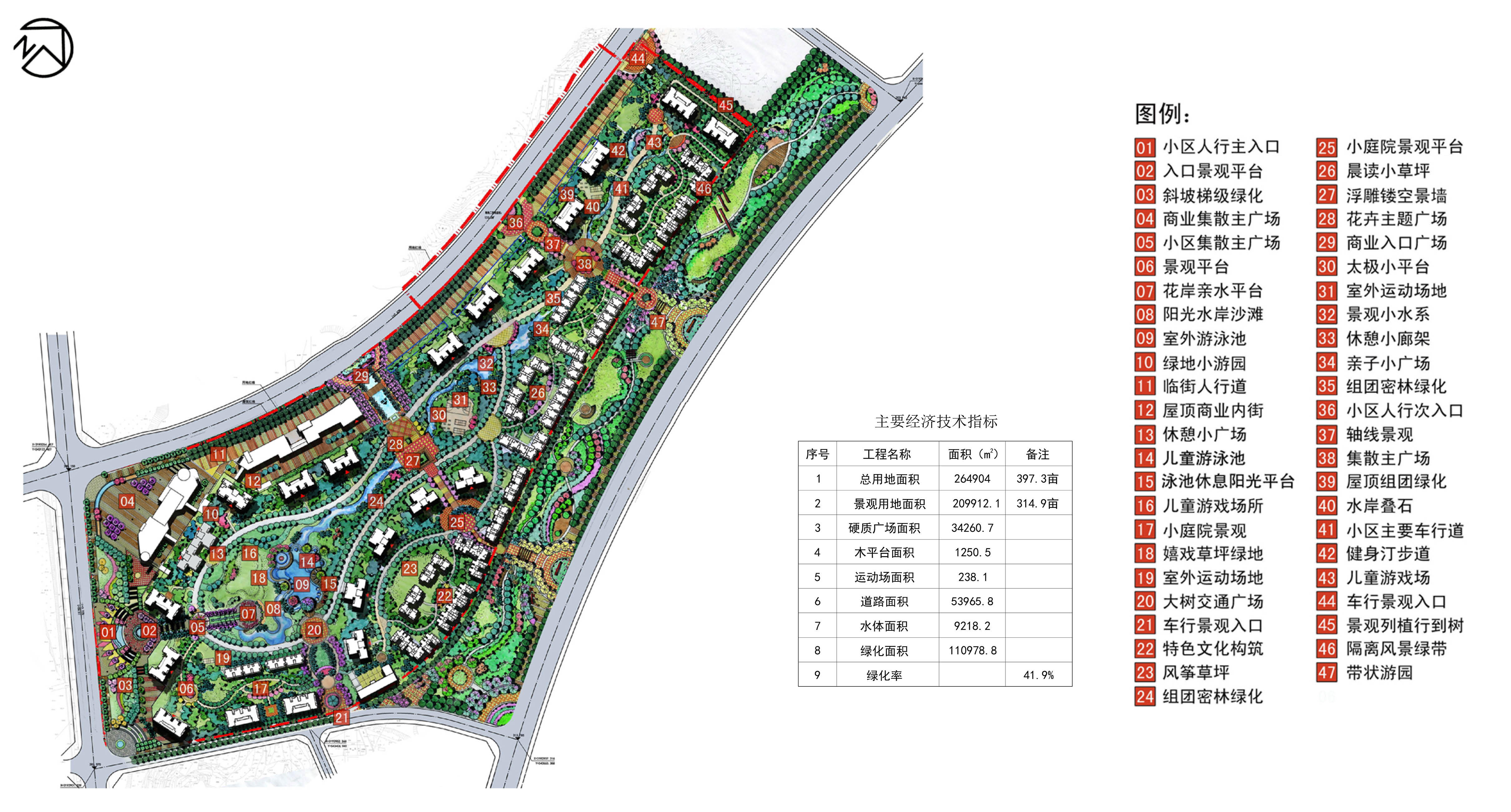 方案設計的靈感來源為抽象的河流,多元素融會貫通,相輔相成,并以曲線的設計形式形成一條抽象的景觀“河流”,在流動中尋求靜謐的休憩之所,打造舒適安逸的人居場所。
