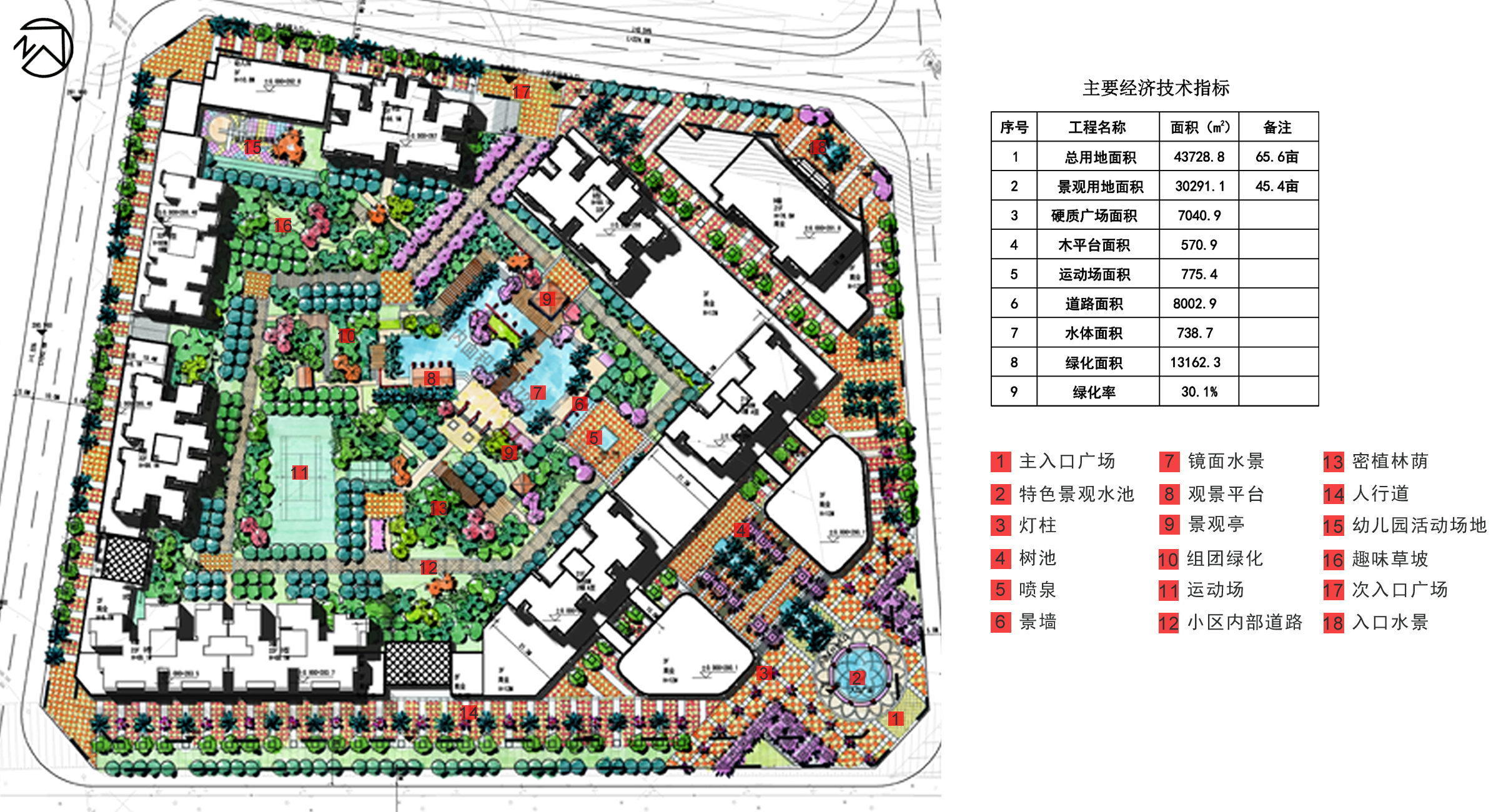 The land is located in Yibin city of Sichuan province, south of Cuiping mountain, and north of Jinsha river. The site is flat, enclosed by planning way, and the transportation is convenient. The design of the landscape is axis layout within the enclosed architecture space. The center of the community is large waterscape. The main entrance landscape sequence axis and the north and South viewing sight axis all surround the central waterscape. The landscape design emphasizes the humanity, and there are various space for different age of people, such as playground and children's playgrounds.