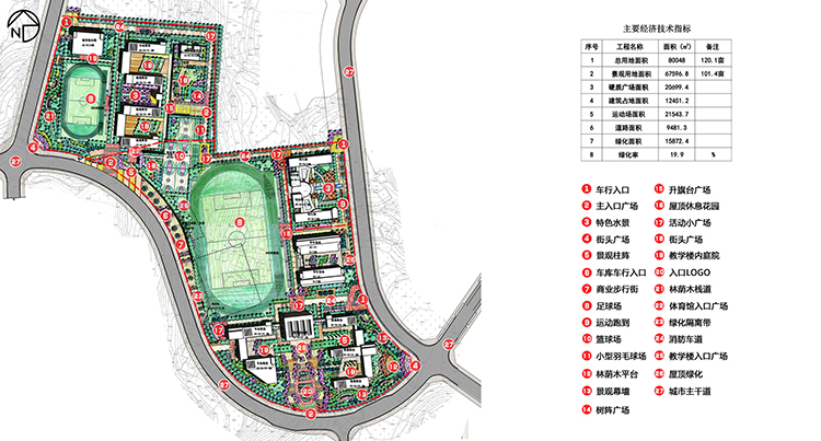 The school includes front campus, teaching area, living area, extracurricular activities area and so on mainly. The design follows different function of each area, thus not only meet the teaching, study, work and life function, but also meet the function of improving teacher-student communication, inspiration, wisdom, self-cultivation, and improving the spirit of creation. The front campus is an important exhibition area, so the design is simple, generous and lively. The design of living area is leisure and kind, to create a pleasant space, and there are lots of tables and stools for teachers and students to communicate.