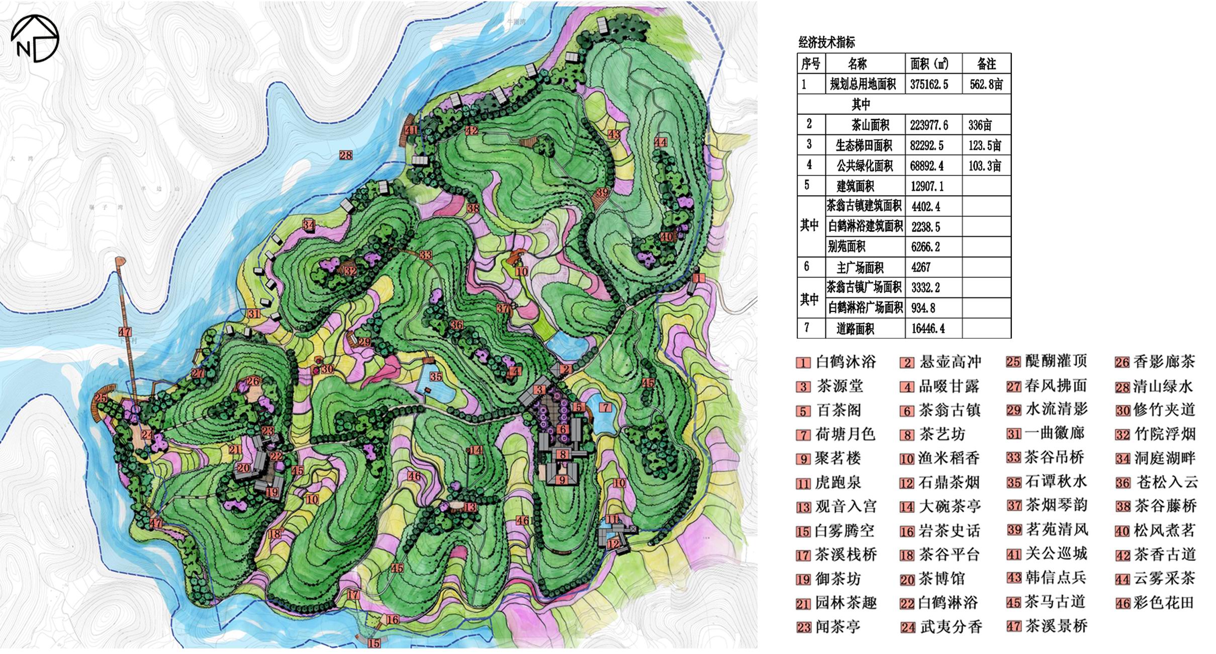 Tea valley is located in the southeast of Tianxian Dong scenic area, the site is surrounded by water on3 sides. The landscape inside is mountain mainly, with scattered water resource. The most of the mountain is covered by tea trees and other plants. There is a primary north-south road and many lanes leading to the mountain. The theme of tea valley is displaying the tea culture, and the function of it is entertainment, leisure, health, cognitive nature, ecological protection to make the citizens relax, play and understand the essence of tea culture. According to the needs of tourists and the construction of the park, the whole valley is divided into 6 parts, that is tea production and processing area, management and office area, tea culture demonstration area, leisure and health area, tea experience area and natural sightseeing tea valley area.