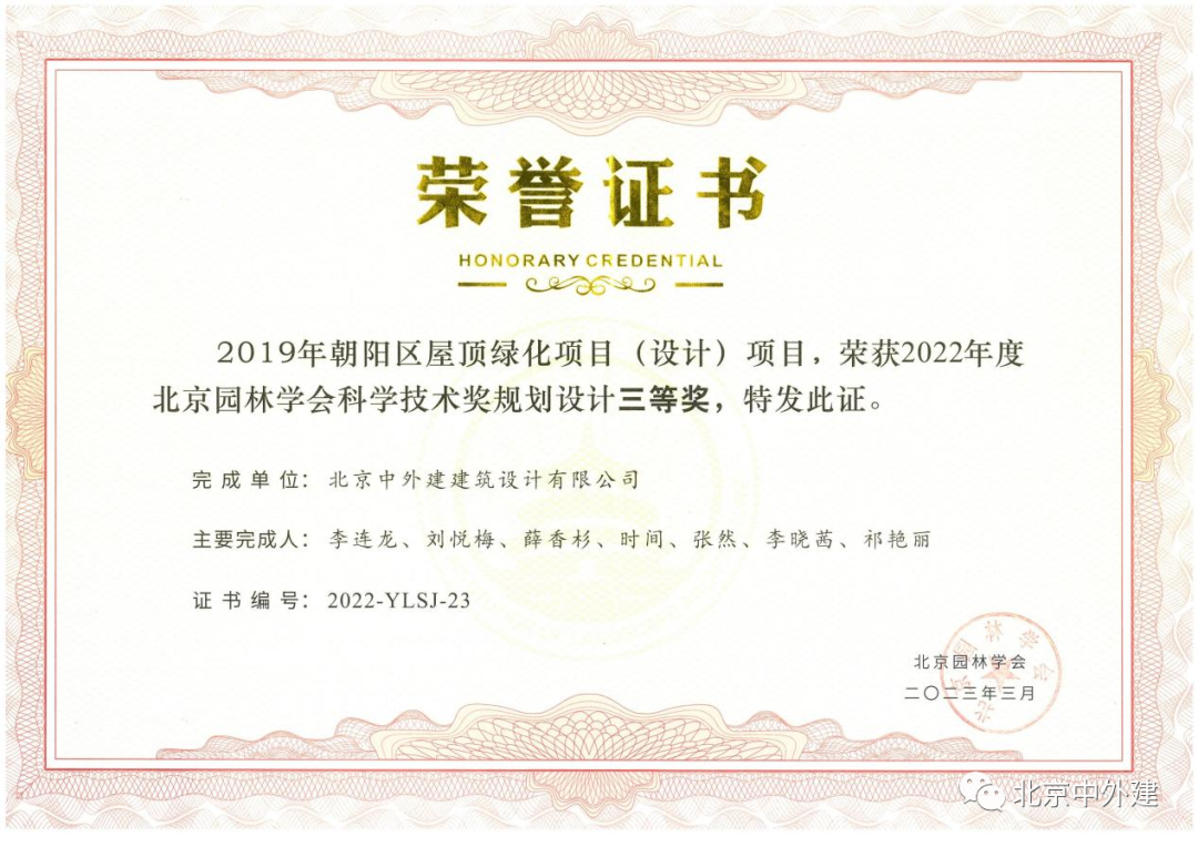 2023年3月,由我公司風(fēng)景園林規(guī)劃設(shè)計院設(shè)計的“2019年朝陽區(qū)屋頂綠化項目(設(shè)計)”項目榮獲“2022年度北京園林學(xué)會科學(xué)技術(shù)獎規(guī)劃設(shè)計三等獎”。本項目投資金額約1533.68萬元,面積約15000平米。包含6個學(xué)校,分別為芳草地國際學(xué)校東洲家園校區(qū)、芳草地國際學(xué)校世紀小學(xué)、北京師范大學(xué)三帆中學(xué)朝陽學(xué)校、北京團結(jié)湖小學(xué)麗水嘉園分校、北京市朝陽區(qū)第二實驗小學(xué)常營校區(qū)、對外經(jīng)濟貿(mào)易大學(xué)附屬中學(xué)朝陽新城分校(朝新嘉園校區(qū))(第九十四中學(xué)朝陽新城分校)。本項目屋頂均為既有建筑屋頂,荷載值多數(shù)為1.0-2.0 KN/m2 ,按常規(guī)設(shè)計手法,無法實現(xiàn)屋頂綠化。為確保屋頂結(jié)構(gòu)安全,設(shè)計采用本公司專利技術(shù)“一種高荷載屋頂綠化結(jié)構(gòu)”,選擇深度150~250mm的輕質(zhì)無機基質(zhì),以小灌木色帶、宿根地被綠化屋面為主體,實現(xiàn)低荷載屋頂綠化的目標。同時,設(shè)計中還引用了其他新技術(shù)、新工藝:1、方案選擇“綠化用無機栽培基質(zhì)”,增加了植物多樣性,豐富了景觀效果,節(jié)省了養(yǎng)護費用,有效截留雨水,滯塵效果好,經(jīng)濟效果顯著。2、方案選用發(fā)光石、透水石等,降低能源消耗,提倡生態(tài)可持續(xù)發(fā)展。我司風(fēng)景園林規(guī)劃設(shè)計院具備充足的屋頂綠化項目儲備和相關(guān)經(jīng)驗,曾多次獲得屋頂綠化類獎項。
