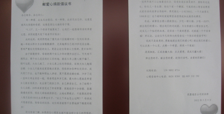 合川十塘書鋪村民 60多歲沒有經濟收入的母親依然艱難的在撫養著40歲生病在家的女兒,生活非常拮據。2014年5月9日,行政部在公司發出“為了一個母親的微笑捐款”倡議,全體同仁積極響應支持。