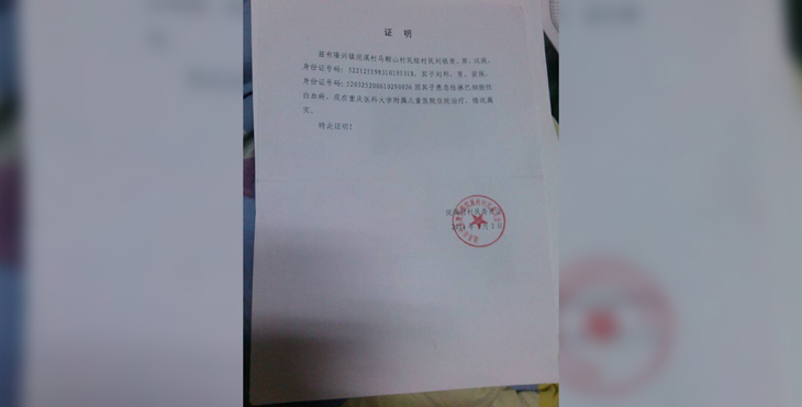 劉幫,男,8歲, 520325200610290036,貴州省遵義市道真仡佬族苗族自治縣新城社區(qū)370棟7樓。劉邦小朋友于2013年2月突感不適,當(dāng)?shù)蒯t(yī)療有限,查不出病因,于2014年2月轉(zhuǎn)院至重慶市第三軍醫(yī)大學(xué)西南醫(yī)院,經(jīng)相關(guān)檢測(cè),發(fā)現(xiàn)劉幫是急性T細(xì)胞淋巴細(xì)胞血病L2型肝瘤溶解綜合征,俗稱(chēng)的白血病。